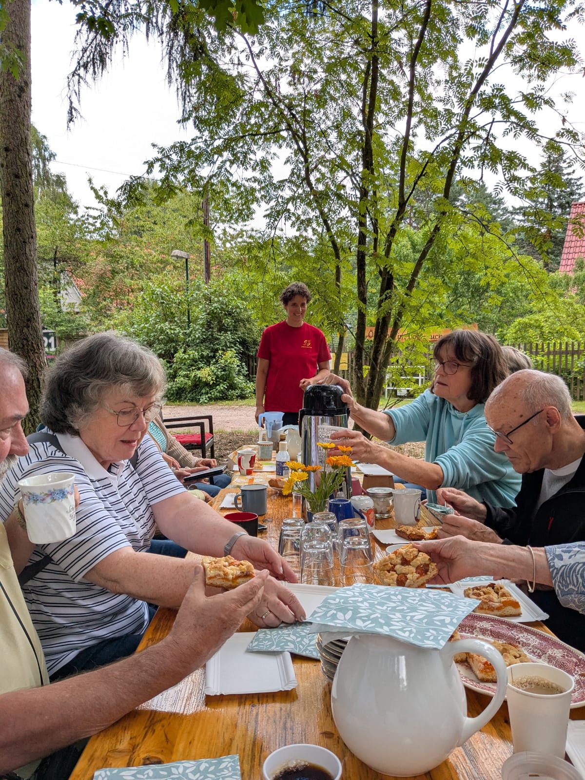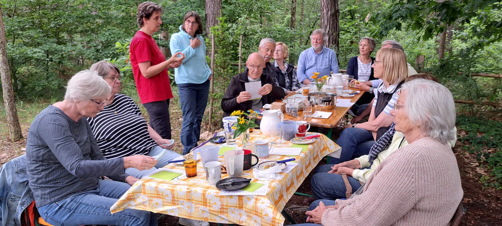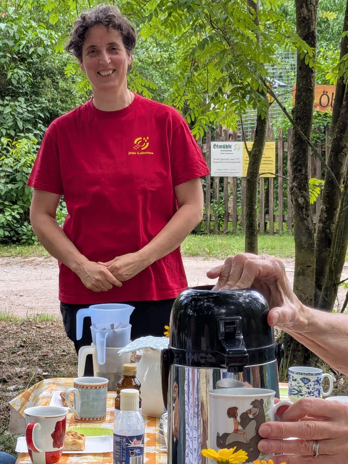 Seit etwa 20 Jahren betreibt Jean Lubenow-Sandek im Borgsdorfer Bogenluch ihre Ölmühle, mit der sie sich nach einem schweren Unfall ein zweites berufliches Standbein geschaffen hat: "Ich wollte nach der Reha etwas machen, woran ich Freude habe, wenn ich im Beruf als Vermessungstechnikerin meine Belastungsgrenze erreichen würde", erläuterte sie uns am einladend gedeckten Tisch am Waldrand. Ergänzend zu unserem mitgebrachten Kaffee und Kuchen hatte sie Kartoffeln gekocht und Quark bereitgestellt, sodass wir auch das vor Ort frisch gepresste Leinöl kosten konnten.