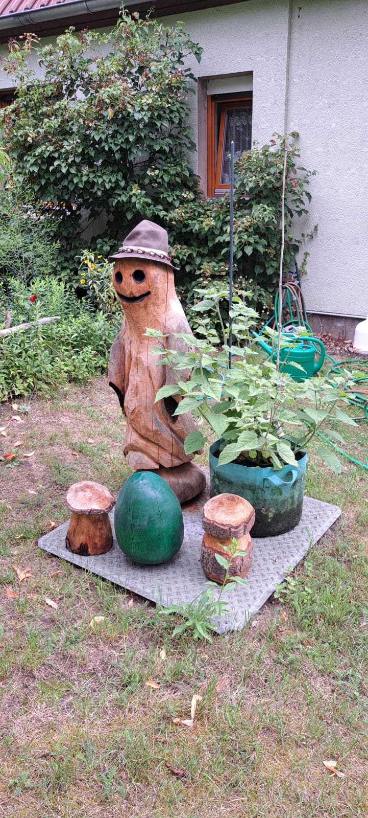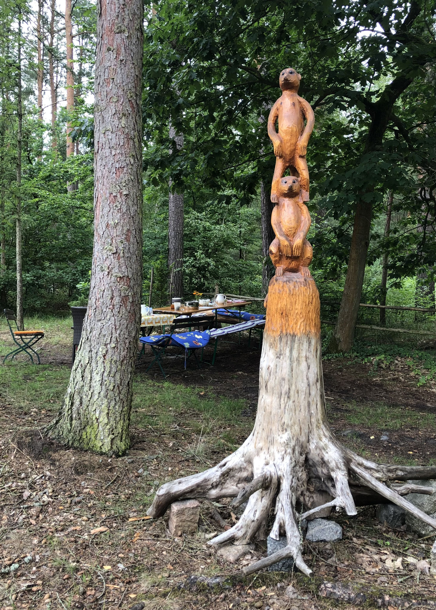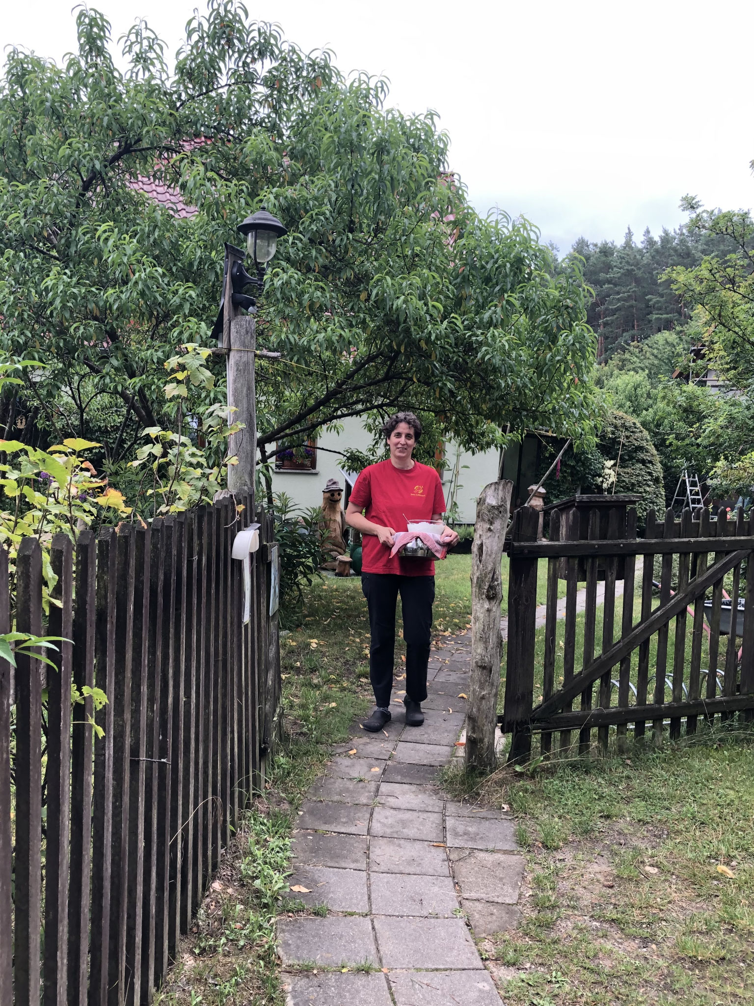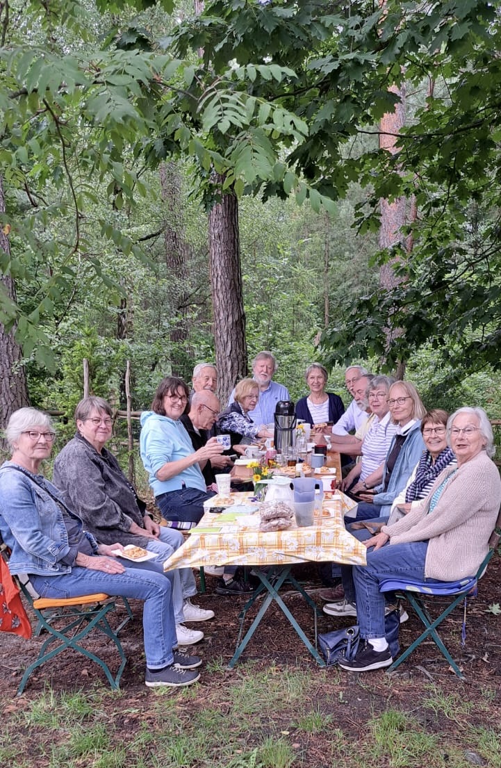 Seit etwa 20 Jahren betreibt Jean Lubenow-Sandek im Borgsdorfer Bogenluch ihre Ölmühle, mit der sie sich nach einem schweren Unfall ein zweites berufliches Standbein geschaffen hat: "Ich wollte nach der Reha etwas machen, woran ich Freude habe, wenn ich im Beruf als Vermessungstechnikerin meine Belastungsgrenze erreichen würde", erläuterte sie uns am einladend gedeckten Tisch am Waldrand. Ergänzend zu unserem mitgebrachten Kaffee und Kuchen hatte sie Kartoffeln gekocht und Quark bereitgestellt, sodass wir auch das vor Ort frisch gepresste Leinöl kosten konnten.