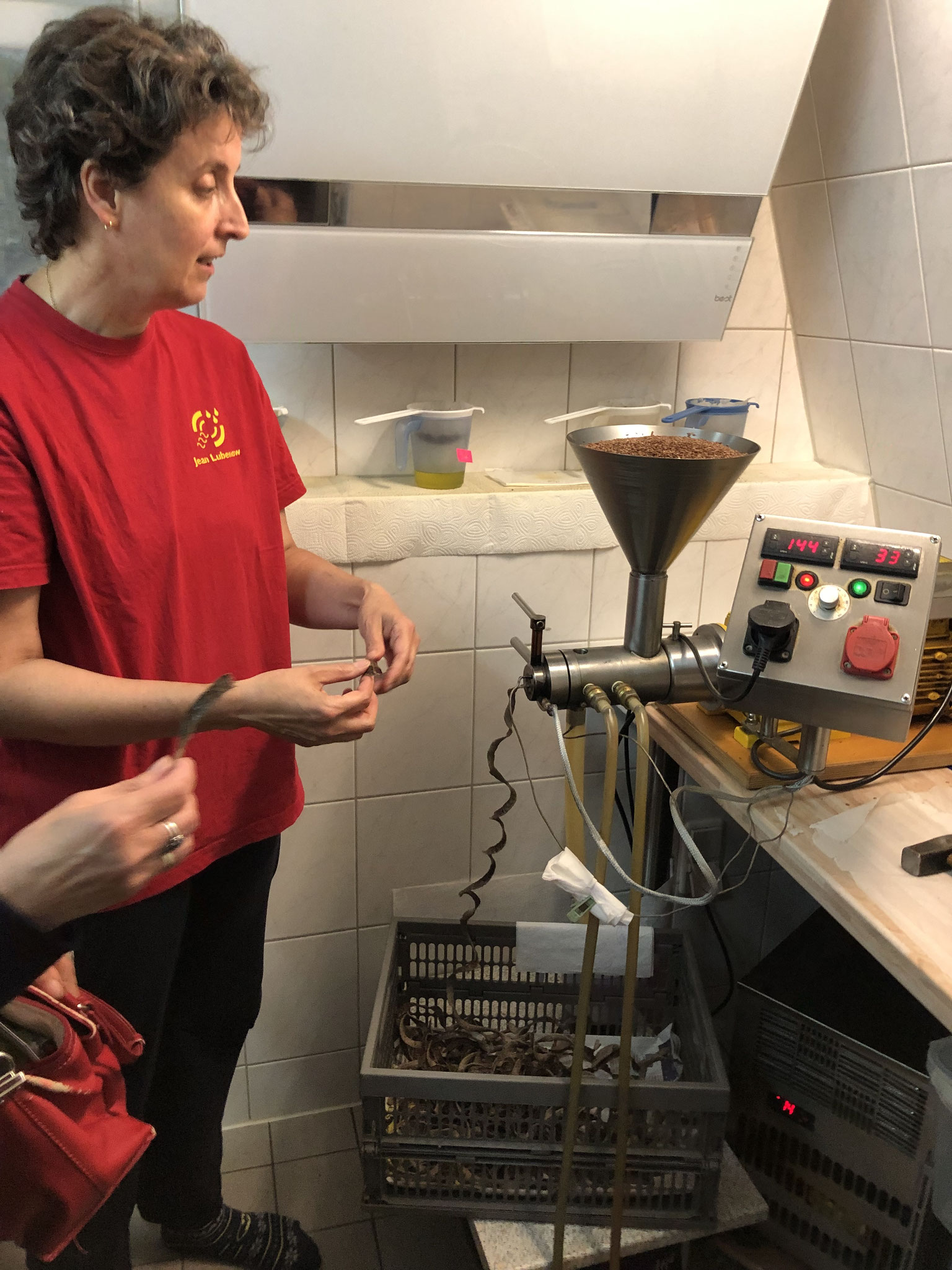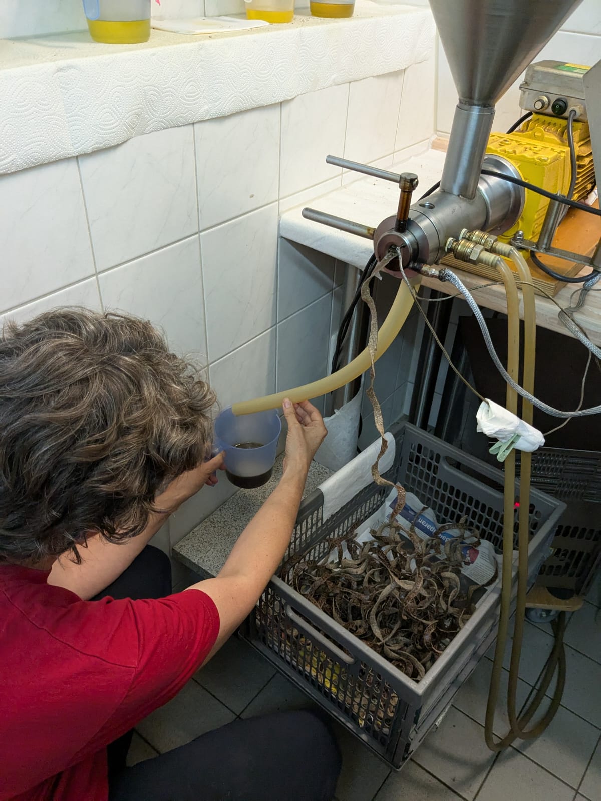 Währenddessen erläuterte uns Jean Konstruktionsmerkmale ihrer 15.000-Euro-Mühle, die sie in Zusammenarbeit mit der Bodensee-Ölmühle teilweise selbst entworfen hat. Und wir erhielten einen anschaulich und unterhaltsam vorgetragenen Einblick in ihren beeindruckenden Kenntnisschatz über Vielfalt und Güte von Saaten und Nüssen, Temperaturabhängigkeiten sowie in rechtliche Bestimmungen der Ölproduktion. Nebenbei bekamen wir mit, dass Jean zu ihrer kleinen Wundermaschine einen nahezu persönlichen Umgang pflegt: Sie und ihr “Mäuschen“ arbeiten sozusagen in harmonischem Einklang miteinander – beide "wissen“, wann was wie zu machen ist!